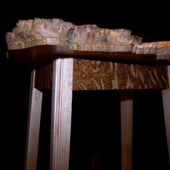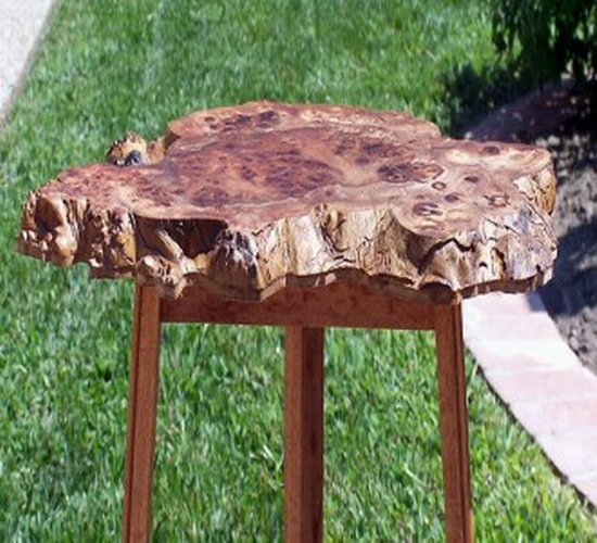 These tables are made out of solid wood. I use mostly Cherry for the legs, Red Oak for the sides (when they have sides) and special "figured" Slices of hardwood for the tops.